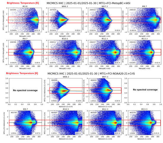 Originally designed for validating radiometric performance through collocations with Metop-IASI, MICMICS has evolved into a primary calibration source for MTG-I1 FCI. Despite this shift in focus, ongoing validation of radiometric performance remains essential. To validate the estimated gains, data from the CrIS instruments on the NOAA-20 and NOAA-21 satellites are used. Collocations from both instruments are combined to ensure sufficient statistical robustness. It has been demonstrated that the two CrIS instruments statistically agree within their respective radiometric uncertainties, with differences generally less than 0.1 K [31,32]. However, CrIS’s spectral coverage excludes certain FCI channels, specifically IR3.8, IR8.7, and a small portion of WV6.3. As a result, IR3.8 and IR8.7 are temporarily exempt from the quality check. Efforts are underway to develop spectral gap-filling techniques to reconstruct these channels and include them in future quality checks. Despite differences in overpass times (IASI: ~9:30 a.m.; CrIS: ~1:30 p.m. mean local solar time), CrIS and IASI exhibit strong overall alignment, with overall differences generally better than 0.25 K [31,32].