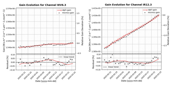 Observations during the fully functional period before the COM anomaly show that the FCI instrument’s radiometric response was stable, with gradually evolving gains in some infrared channels due to ice contamination [11] and no abrupt deviations. However, minor daily fluctuations in estimated synthetic gains occasionally occur, influenced by factors such as dynamic range, number of collocations, and retrieval model uncertainties.