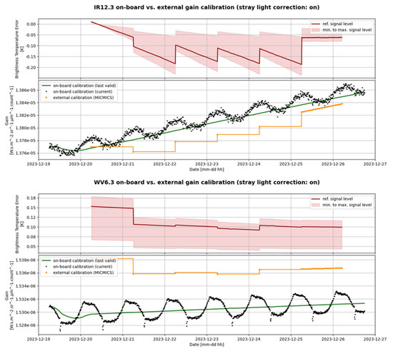 The on-board gains are plotted for two cases: the last valid and the current. The current gain is derived from a single calibration measurement, whereas the last valid gain is a 24 h rolling average of the calibration measurements. This averaged data forms the basis for performance budgets and the Level-1 processing. The gain error between the on-board calibration and the external calibration has been translated into a scene brightness temperature error based on the specified scene levels. Errors derived from the reprocessing campaign are summarized in Table 1. While the reported Tb errors for most channels are within the typical range observed for legacy MSG SEVIRI IR channels when monitored using GSICS methods [11], the IR13.3 channel shows a larger error. However, this remains within the historical variability seen in SEVIRI performance. The cause of this discrepancy is currently under investigation to gain a clearer understanding of the contributing factors.