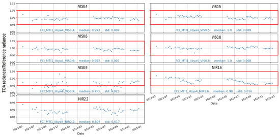Radiometric performance of VNIR channels (excluding NIR1.3) over Libya-4 desert. Each point represents a 7-day average. The red lines indicate the User Requirements (<5%) for FCI VNIR channels. VIS0.4–VIS0.9 meet the user requirement, while NIR1.6 shows seasonal trend.