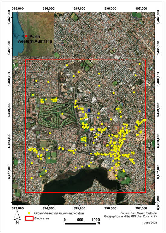 The presented downscaling approach is tested on the Curtin University Bentley campus and in the surrounding areas, located in the City of Canning, Western Australia. It is approximately 16 square kilometres (3.8 km × 4.2 km) (Figure 1). The local climate is classified as warm temperate and Mediterranean, where it is hot, dry, and sunny during the summer and milder and wetter during the winter [29]. Recently, the area of interest has experienced a phase of urban infill [30]. It can be considered a medium-density building in urban areas. The area has plenty of land cover types, including buildings where the roof type is mainly tiles and Colorbond (steel), vegetation covers such as trees and grasslands, paved areas such as parking lots, wide and narrow streets, open earth areas, and water bodies to demonstrate the variability of the UHI effect. Outside the campus, the zone encompasses residential block areas bounded by roads. A part of the Canning River flows in the southern part of the study area (Figure 1).