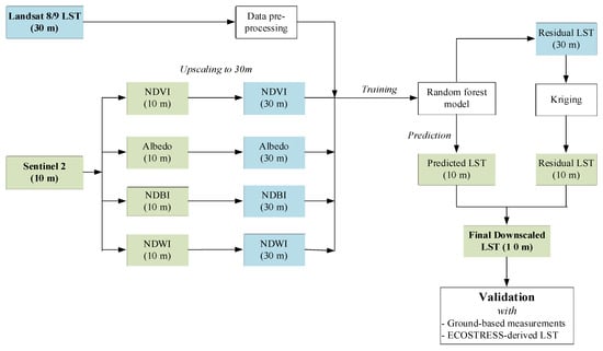 The 30 m LST derived from L8/9 was downscaled using the proposed method “GeoML”. Using the bilinear resampling method, the 10 m independent variables, including albedo, NDVI, NDBI, and NDWI, were upscaled to 30 m. Then, the random forest (RF) model was trained using the ranger package in R programming. The high-resolution LST was obtained by using the model prediction at 10 m. The 30 m residual LST was downscaled to 10 m using ordinary kriging and then combined with the high-resolution prediction from RF to obtain the results.