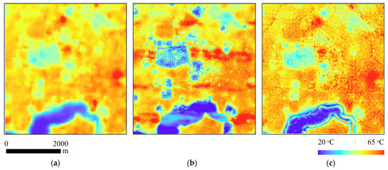 In this study, the high-resolution urban thermal sharpener (HUTS) downscaling method was also applied to downscale the same data, and the results were used as a reference for comparison. The HUTS model expressed the value of LST as a non-linear function: a 4th-order bivariate regression based on NDVI and the surface albedo. The downscaling consists of applying Equation (10) to the NDVI and albedo of each high-resolution pixel to obtain the predicted high-resolution LST.