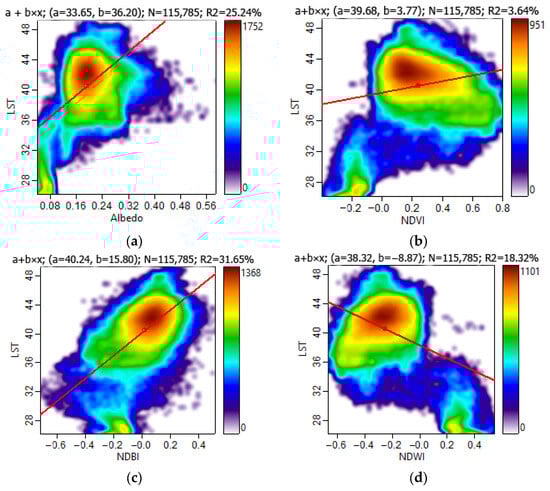 Scatterplots showing the correlation between spectral indices and LST: (a) LST and albedo, (b) LST and NDVI, (c) LST and NDBI, (d) LST and NDWI. Data from imagery captured on 12 December 2023. The value in the legend indicates the number of points per pixel.
