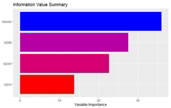 The result of variable importance for the data on 12 December 2023 is presented in Figure 5, where the rank of the variable importance is highlighted. In terms of percentage, the contributions of surface albedo, NDBI, NDWI, and NDVI are 27.58%, 22.66%, 13.74%, and 6.02%, respectively. In Figure 5, the contribution of independent variables gradually decreases. The surface albedo has the highest importance among all the variables, indicating a high correlation between the LST and albedo (Figure 4a), which is explained by the massive presence of dark and reflective roofs and asphalt in the study area. NDBI was the second most important predictor, which is also highly correlated to LST due to the high proportion of built-up area. The least important variables are NDWI and NDVI due to the low correlation between these indices and the LST, which can be explained by the low abundance of water and sparse vegetation in the study area.