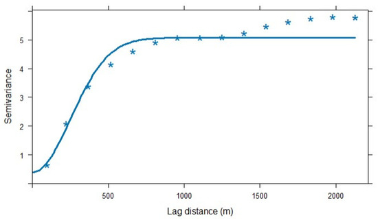 where is the predicted residual LST value at the target location , represents the known residual LST at 30 m resolution, and represents the kriging weights. They are determined by solving the kriging system, ensuring an unbiased estimate with minimum variance. Specifically, the weights are obtained by fitting a variogram model to the observed data. A variogram describes the correlation between observation values and the distance between locations. For this study, the Gaussian variogram model defined in Equation (9) was used.