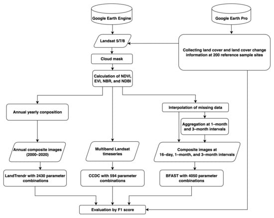 The Landsat time-series sequence created on GEE was used directly as the input. The bands/indices tested in the CCDC include B1, B2, B3, B4, B5, B7, NDVI, EVI, NBR, NDBI, and the combination of [B1–B7], for a total of 11 types. The evaluated parameters are listed in Table 2. A total of 594 parameter combinations derived from 54 combinations of four parameter values and 11 input bands/indices were evaluated for accuracy.