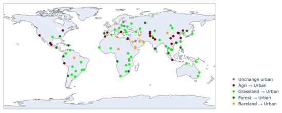 We collected a reference sample dataset using historical, very high-resolution satellite image time series from Google Earth Pro that matched the pixel size of the Landsat imagery [68]. We initially established equal sample sizes for two categories: areas transitioning from non-urban to urban at the urban fringe, and non-urban regions showing no change. After removing unavailable sampling data, we analyzed 200 areas in total: 101 areas where land cover transitioned from non-urban to urban at the urban periphery, and 99 areas where no changes occurred in non-urban regions across the globe. Land cover was documented through visual inspection of historical high-resolution satellite time series in Google Earth Pro, with the year and location of land cover changes recorded annually.