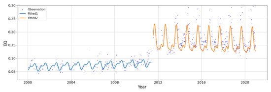 The CCDC algorithm creates a linear harmonic model that incorporates sine and cosine curves using all available Landsat time series (Figure 5) [31]. Land cover changes are detected by representing seasonal components, trend components, and abrupt changes in the time-series data. The primary processing flow of the CCDC begins with the removal of clouds, shadows, and snow noise using bands 2 and 5. Based on the 12 cloud-free observations in the input time-series data, a fitting model (Equation (5)) was initialized using the ordinary least squares (OLS) method. If the difference between the predicted and observed values exceeded the threshold for the number of times specified by the minObservations parameter, a change was detected.