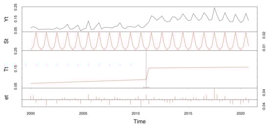 BFAST uses STL decomposition and the moving sum of ordinary least squares (OLS_MOSUM) method to detect changes in the seasonal or trend components of univariate time-series data (Figure 6) [32]. STL decomposes time-series data into three components: trend, seasonal, and residual, as shown in Equation (6). OLS_MOSUM calculates the moving sum of OLS estimates for a specific data interval and evaluates whether this sum shows a statistically significant change. The main processing flow of BFAST begins with decomposing the input univariate time-series data into trend, seasonal, and residual components using STL decomposition. The algorithm then calculates the cumulative difference over time between the trend component ( T t ) and the regression line using OLS_MOSUM. Breakpoints (identified as land cover changes) were detected when the cumulative sum exceeded the threshold.