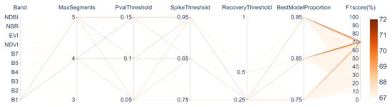 The detailed parameters for LandTrendr that achieved high F1 scores are shown in Figure 7, and the top ten parameter combinations with the highest F1 scores are summarized in Table 6. All of the top ten parameter combinations used B1 as the input. Figure 8 illustrates how the different parameter settings in LandTrendr affect N T P and N F P . High F1 scores were obtained when MaxSegments was set to four or five. Setting MaxSegments to three minimized N F P but increasing N F N resulted in a lower F1 score. The PvalThreshold (p-value thresholds) was set to 0.05, 0.1, and 0.15. While N T P and N F P showed minimal variation, settings of 0.10 and 0.15 achieved higher F1 scores. For SpikeThreshold, higher values decreased N F P whereas N T P remained relatively stable. A maximum value of 0.95 yielded the highest F1 score, likely because the annual compositing of input time-series data had already reduced noise impacts. The RecoveryThreshold performed the best at a value of 0.25. Lower values of RecoveryThreshold decreased N F P while maintaining N T P . For BestModelProportion, changing parameter values caused minimal variation in N T P , N T N , N F P , and N F N , and a setting of 0.85 and 0.95 achieved the higher F1 score.