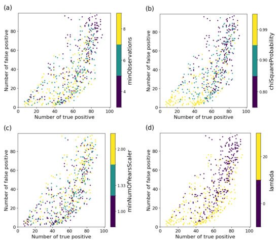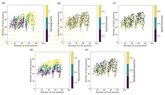 In this study, we evaluated 2430 parameter combinations for LandTrendr, 594 for the CCDC, and 4050 for BFAST. Figure 16a–c illustrates the relationship between N T P and N F P for the parameters of each model. LandTrendr (Figure 16a) showed a correlation coefficient of 0.32 between N T P and N F P , indicating a weak linear relationship. In contrast, CCDC (Figure 16b) and BFAST (Figure 16c) showed stronger relationships, with correlation coefficients of 0.72 and 0.52, respectively. This suggests that, for both CCDC and BFAST, increases in N T P are typically accompanied by increases in N F P .