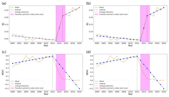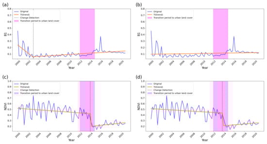 Figure 15 illustrates BFAST outputs at an example point that transitioned from Grassland to Urban in 2014. Using B1 as input with optimized settings (Figure 15a) and with default settings (Figure 15b), both failed to detect urban land cover change, whereas using NDVI as input with both optimized settings (Figure 15c) and the default settings (Figure 15d) successfully detected the change. For (a), the parameters were: h = 0.15, Season = dummy, Breaks = 2, Level = 0.15, and the data type was 3-month. For (c), the parameters were: h = 0.15, Season = none, Breaks = 2, Level = 0.15, and the data type was 3-month. For both (b) and (d), the parameters were used: h = 0.15, Season = harmonic, Breaks = Null, Level = 0.05, and the data type was 3-month.