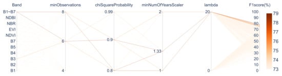 We selected 10 input bands: B1, B2, B3, B4, B5, B7, NDVI, EVI, NBR, and NDBI. The evaluated parameters are presented in Table 3. We assessed the accuracy across 4050 parameter combinations derived from 135 combinations of four parameter values, 10 input bands, and three time-series data types.