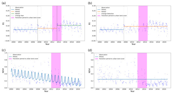 Figure 12 illustrates CCDC outputs at a point that transitioned from Farmland to Urban in 2014. Using B1–B7 with the optimized parameter settings (Figure 12a) correctly detected urban land cover change, whereas other settings using B1–B7 with the default settings (Figure 12b), and using NDVI with optimized (Figure 12c) and default settings (Figure 12d) failed to the urban land cover change detection. For (a), the parameters were: m i n O b s e r v a t i o n s = 6 , c h i S q u a r e P r o b a b i l i t y = 0.9 , m i n N u m O f Y e a r s S c a l e r = 1.33 , and l a m b d a = 20 . For (c), the parameters were: m i n O b s e r v a t i o n s = 8 , c h i S q u a r e P r o b a b i l i t y = 0.8 , m i n N u m O f Y e a r s S c a l e r = 1.0 , and l a m b d a = 0 . For both (b) and (d), the following parameters were: m i n O b s e r v a t i o n s = 6 , c h i S q u a r e P r o b a b i l i t y = 0.99 , m i n N u m O f Y e a r s S c a l e r = 1.33 , and l a m b d a = 20 .