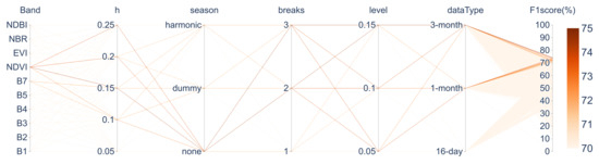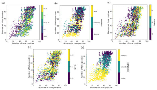 The association between parameters and F1 scores for BFAST is shown in Figure 13, and the top ten parameter combinations with the highest F1 scores are shown in Table 8. Figure 14 illustrates the effects of the different parameter settings in BFAST affect N T P and N F P . A higher h tends to achieve a higher F1 score, with decreasing N F P while minimally affecting N T P . Setting the Season parameter to none tends to yield a higher F1 score. Although the dummy and harmonic settings increased both N T P and N F P compared to none, this resulted in a lower F1 score. For Breaks, values of 2 and 3 tend to achieve higher F1 scores. Unlike LandTrendr and CCDC, increasing the Break parameter did not significantly increase N F P . The Level parameter for the s c t e s t . e f p test threshold had a minimal impact on the F1 scores. Time-series data at 3-month intervals tends to produce a higher F1 score, whereas 16-day interval data showed a high N F P , resulting in a lower F1 score.