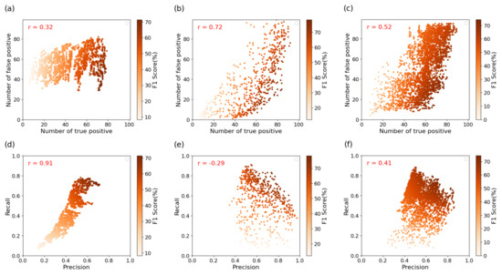 Figure 16d–f show the effect of parameter settings on the relationship between Recall and Precision for each model. LandTrendr (Figure 16d) exhibited a correlation coefficient of 0.91, indicating that a higher recall corresponded to substantially higher precision. The CCDC (Figure 16e) showed the opposite trend, with a correlation coefficient of −0.29, revealing a trade-off in which increased recall led to decreased precision. For BFAST (Figure 16f), despite a positive correlation coefficient of 0.41, precision improvements were modest compared with recall increases.