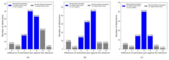Figure 17 shows the distribution of the predicted land cover change years based on the parameter combinations that achieved the highest F1 scores for each model. On the horizontal axis, 0 represents detection in the year of building completion, while −1 indicates detection one year before completion. The CCDC, with its largest input dataset, typically detects changes during the completion year. LandTrendr and BFAST, using fewer inputs, tended to detect changes one year before completion. Because we defined land change as occurring within two years before completion to account for site preparation and construction time, all models showed frequent detections within this range. This suggests that the models detect land cover changes associated with urbanized land cover developments, including site preparation, rather than solely identifying the building completion year.