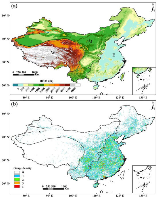 (a) The DEM distribution of Mainland China, where W, M, and E represent the three subregions of west, midwest, and east, respectively. (b) The spatial distribution of automatic rain gauges in the CMPA with a 0.1° spatial resolution from 1 January 2015 to 31 December 2018.