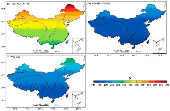 Figure 2 illustrates the sampling frequency distribution for the DPR SVCs over the study period. Notably, the scanning paths and frequencies are identical for the NS mode of DPR-V06 and DPR-V07 (hereafter referred to as DPR-V06-NS and DPR-V07-FS, with similar abbreviations applied for other modes). Among the various DPR scanning modes and versions, DPR-V06-NS and DPR-V07-FS have the highest number of samples, ranging from 300 to 700 (from 1 January 2015 to 31 December 2018), while DPR-V06-HS and DPR-V07-HS have the fewest, ranging from 100 to 300. The difference in sample numbers among the scan modes is due to the number of rays per scan type (HS: 24 rays; MS: 25 rays; FS or NS: 49 rays). The DPR-MS contains slightly more samples than DPR-HS but significantly fewer samples than the DPR-NS. Spatially, the DPR sampling frequency increases with the latitude across all scanning modes, with higher latitudes receiving more samples due to the inherent orbital trajectory.