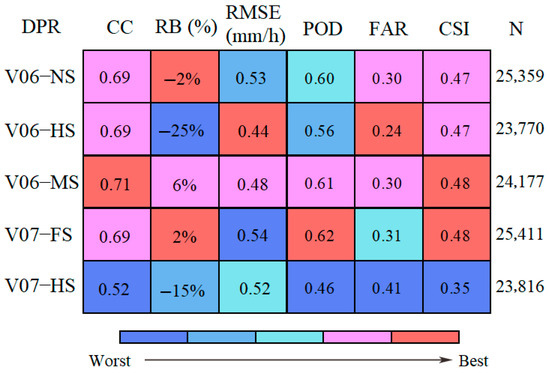 Statistical metrics of the DPR SVC retrieval algorithms against the CMPA over Mainland China at hourly time scales (N denotes the number of matched samples).