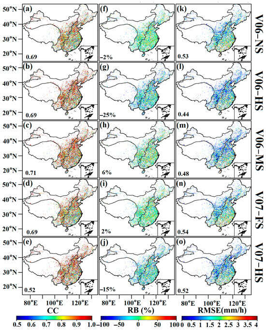 Spatial distributions of statistical metrics for the DPR SVCs over Mainland China: the CC (a–e), RB (f–j), and RMSE (k–o). The value in the lower left corner is the average of the corresponding indicator.