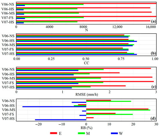 To ascertain the differences in the precipitation quantification performance among various DPR SVCs across different altitude regions, which can be found in Figure 5, the HS and MS modes outperform the NS and FS modes a little in three subregions. The CC values for the DPR SVCs exhibit little variation among the three subregions, ranging between 0.75 and 0.80. All CCs of DPR SVCs in regions M and W are slightly higher. DPR-V07-HS elevates the RMSE in region E relative to DPR-V06-HS, whereas it reduces the RMSE in region W. It is worth noting that the sample sizes (N) vary considerably across the three regions, with region E having significantly more matched samples than regions M and W. This discrepancy in the sample size may partially influence the stability and representativeness of the statistical metrics, especially in high-altitude areas where observations are sparser.