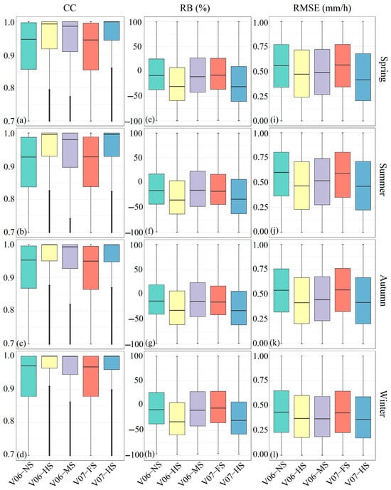Boxplots of DPR SVCs in four seasons over Mainland China: CC (a–d), RB (e–h), and RMSE (i–l).