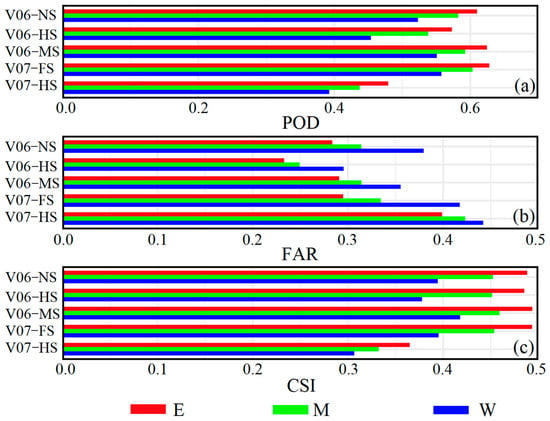 The further regional analysis of the detection performance is presented in Figure 8, which compares the POD, FAR, and CSI metrics across three subregions for different DPR SVCs. The results demonstrate a clear spatial variability, with the overall performance being highest in region E and lowest in region W. Among all versions, DPR-V07-HS exhibits the poorest precipitation detection performance, consistently showing the highest FAR and lowest POD and CSI values across all subregions. Compared to DPR-V06-HS, DPR-V07-HS shows a significant degradation, with the CSI decreasing by 24.79% in region E, 26.36% in region M, and 18.84% in region W.