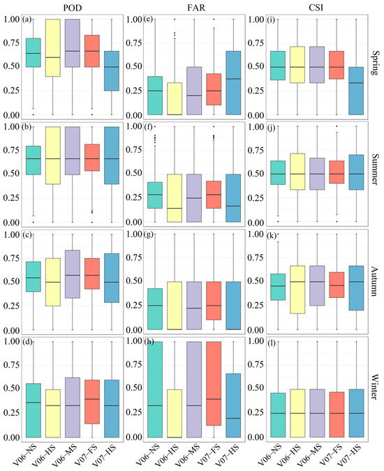 Boxplots of spatial categorical metrics for DPR SVCs in four seasons over Mainland China: POD (a–d), FAR (e–h), and CSI (i–l).