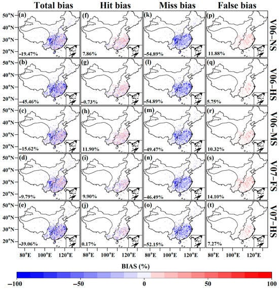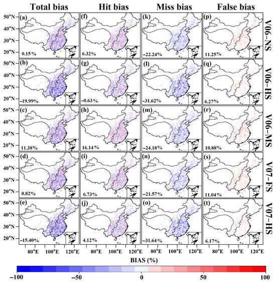Spatial distributions of error components of DPR SVCs during the summer months over Mainland China: the total bias (a–e), hit bias (f–j), miss bias (k–o), and false bias (p–t). The figure in the lower left corner is the mean of the corresponding indicator.