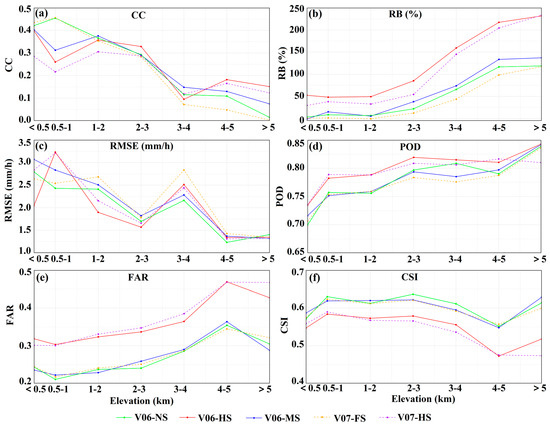 Elevation distributions of continuous metrics for DPR SVCs over Mainland China: (a) CC, (b) RB, (c) RMSE, (d) POD, (e) FAR, and (f) CSI.