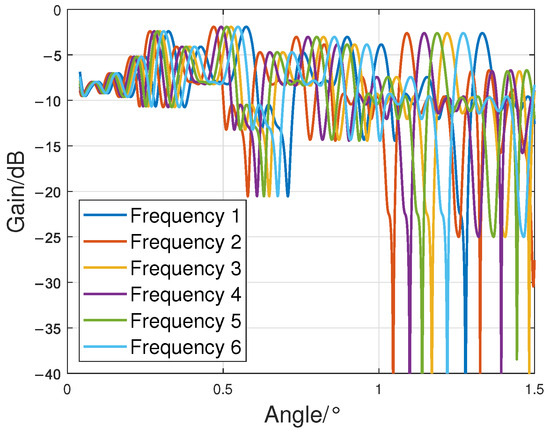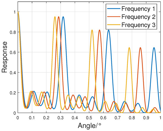 As indicated by (10), if the radar uses multiple carrier frequencies for jamming suppression, it is equivalent to varying the carrier frequency term f to scale the angular term . Therefore, the effect of carrier frequency variation on the beam pattern can be equivalently interpreted as scaling along the angular dimension, as illustrated in Figure 3.