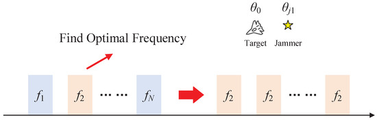 In practical applications, using multiple pulses with different frequencies can lead to challenges in achieving coherent accumulation across pulses. Consequently, continuously employing multiple sub-pulses may not be the optimal approach. In the proposed framework, after designing the radar position and carrier frequency, the optimal frequency under specific jamming scenarios (e.g., target-jammer angle separation) is uniquely determined. This motivates the development of a frequency selection strategy to identify the most performant frequency within the current scenario. Subsequent transmissions then focus exclusively on this single optimal frequency to avoid SNR loss caused by incoherent accumulation of signals with different carrier frequencies. This approach is illustrated in Figure 6.