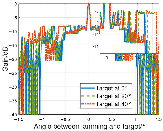 The simulations in the paper also validate this point. Figure 9 shows that the first null of the beam pattern optimized by the proposed algorithm is approximately 0.05°, and Figure 11a demonstrates that the anti-jamming performance of the proposed method begins to degrade rapidly when the angle between the jamming and target is less than 0.05°.