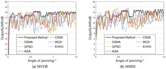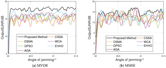 Under the same parameter settings except that the target angle is set to and the jamming angle is varied within the range of ∼, the resulting output SJNRs are shown in Figure 12.