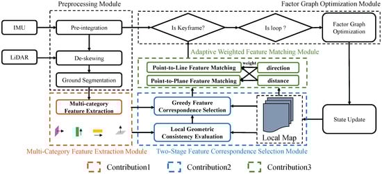 Figure 1 illustrates our proposed system consisting of five modules. In the preprocessing module, the raw point cloud data is input, and distortion correction is performed using IMU acceleration and angular velocity measurements. Ground points are then separated from non-ground points through ground filtering. In the multi-category feature extraction module, the non-ground point cloud is input, and points are categorized into multiple feature classes based on local linearity, planarity, and curvature computed using principal component analysis (PCA). In the two-stage feature correspondence selection module, the initial correspondence set is first evaluated using local geometric consistency to remove outliers. Then, a greedy selection strategy is employed to finely select the most contributive subset of feature correspondences. In the adaptive weighted feature matching module, in the adaptive weighted feature matching module, point-to-line and point-to-plane geometric residuals are used for pose estimation, and an adaptive weighting strategy based on distance and directional consistency is applied to enhance stability. Finally, in the factor graph optimization module, LiDAR feature matching factor, the IMU preintegration factor, and loop closure factor are jointly optimized using incremental smoothing to further refine the estimated LiDAR-inertial odometry poses.