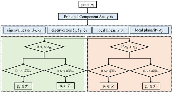 Here, n represents the number of neighboring points searched. Next, we perform singular value decomposition (SVD) on the covariance matrix to obtain the eigenvalues () and their corresponding eigenvectors. These features can be differentiated using the eigenvectors of the covariance matrix. The largest eigenvector, denoted as l, represents the main distribution direction of the neighborhood point cloud, while the smallest eigenvector, denoted as n, represents the normal vector of the neighborhood point cloud. Discrete points that do not have enough neighboring points will be filtered out. By utilizing the eigenvalues of the covariance matrix, we can compute the local linearity and planarity of the point cloud, as expressed by