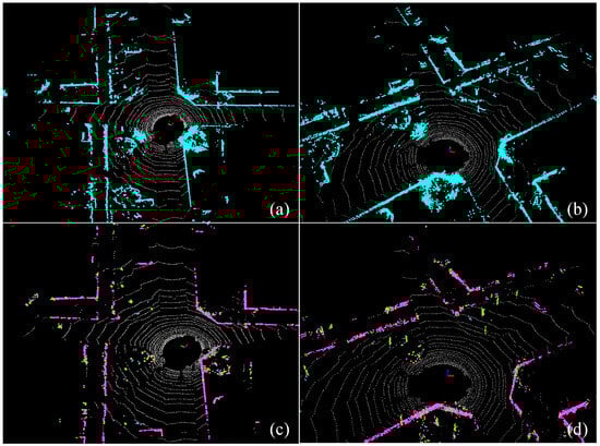 Figure 3 illustrates the feature extraction results of the proposed method. Figure 3a,b show the ground and non-ground segmentation results in two different scenes. Figure 3c,d present the subsequent multi-category feature extraction results from the non-ground points, where pillars are shown in green, facades in magenta, beams in yellow, and roofs in light blue.