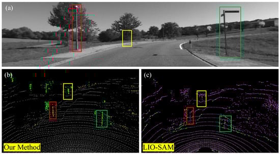 Comparison of feature extraction results between LIO-SAM and the proposed method. (a) shows the visual image of a sparse scene, while (b,c) illustrate the feature extraction results of our method and LIO-SAM, respectively. The color scheme of the extracted feature points in our method is consistent with that in Figure 3. In LIO-SAM, edge features are shown in green, and planar features are shown in magenta. The red, yellow, and green boxes highlight the differences between our feature extraction results and those of LIO-SAM.