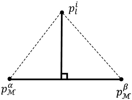 Firstly, to establish the correspondence between the features of the current frame and the local feature map, we use the KD-tree nearest neighbor search to identify the features of the same category and determine the feature correspondence. For line features (such as ) in the current frame, when the largest eigenvalue of the covariance matrix of the point set within the search area is much greater than the second-largest and smallest eigenvalues, it indicates that the line feature search is correct. Subsequently, the two closest points and are found in the local line map, as is shown in Figure 5, and the line-to-line residual can be expressed as