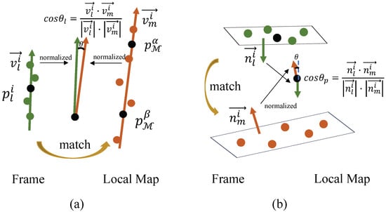 Similarly, as shown in Figure 7b, denotes the normal vector of a feature point in the current frame obtained using PCA, while represents the normal vector estimated from neighboring points in the local map. The value between the two normalized vectors is used to evaluate their consistency. A correct feature correspondence can be represented as