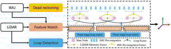 Illustration of the factor graph optimization framework integrating LiDAR, inertial, and loop closure constraints.The flow blocks and arrows with a yellow background represent operations executed by the IMU; those with an orange background correspond to operations performed by the LiDAR; and those with a blue background indicate operations related to loop closure detection.