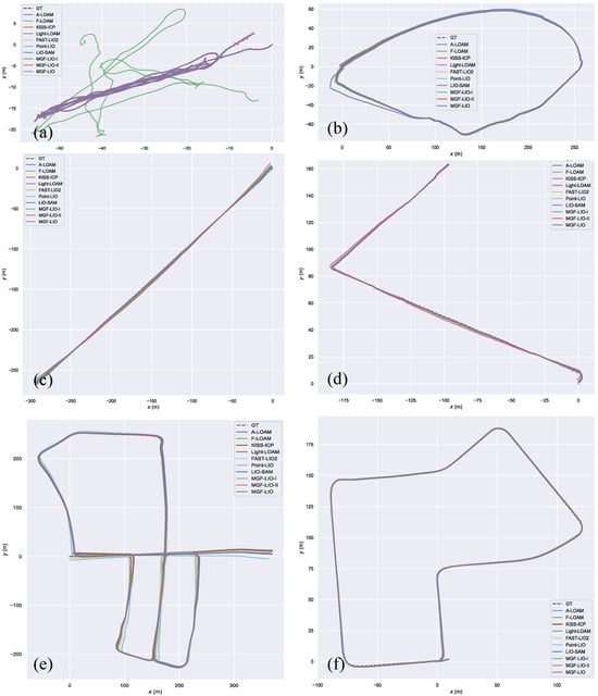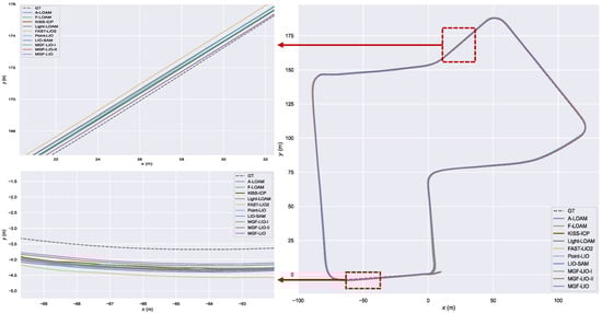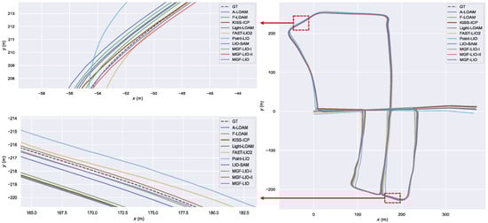 To evaluate the performance of our proposed methods on public datasets, we conducted detailed comparisons with A-LOAM, F-LOAM, and LIO-SAM. The evaluations were performed on the M2DGR dataset using the street03, street04, street05, and street06 sequences, and on the KITTI dataset using sequences 05 and 07. The comparative results are summarized in Table 1. Our methods achieved higher accuracy across both datasets compared to A-LOAM, F-LOAM, KISS-ICP [31], Light-LOAM, FAST-LIO2, Point-LIO [32], and LIO-SAM, with an average minimum trajectory error of 0.643 m.