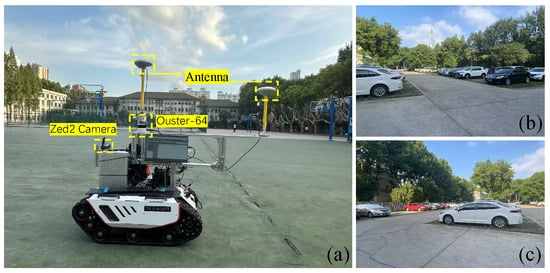Experimental platform and scene images of the campus test environment. (a) shows the experimental platform, with the LiDAR, camera, and antenna highlighted in the yellow dashed box. (b,c) present the real-world scenes from the campus test environment.