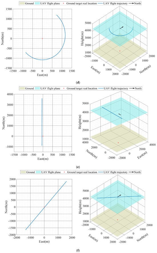 UAV flight trajectory (a) UAV flight trajectory of Experiment A, (b) UAV flight trajectory of Experiment B, (c) UAV flight trajectory of Experiment C, (d) UAV flight trajectory of Experiment D, (e) UAV flight trajectory of Experiment E, (f) UAV flight trajectory of Experiment F.