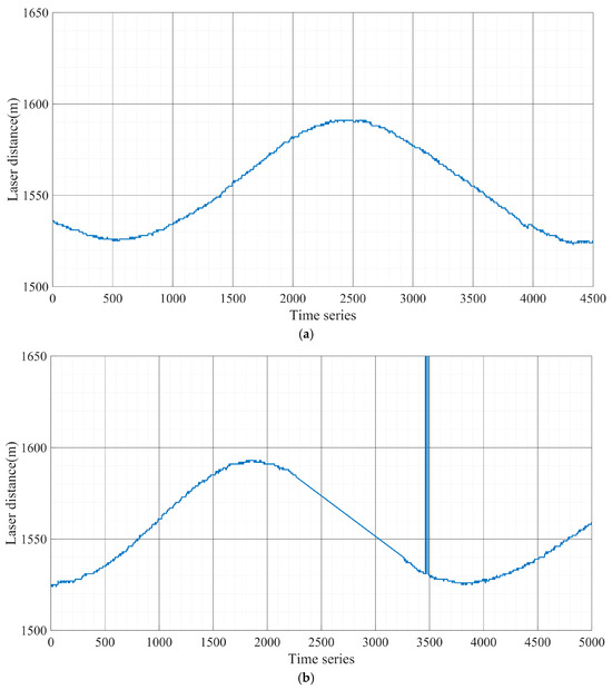 We set up Experiment A and Experiment B as a free circling reconnaissance of ground targets by the UAV using a visible vision sensor, during which the laser ranging sensor was briefly turned off. We used the UAV to perform free circling reconnaissance of ground targets at an altitude of 2400 m, with a hovering radius of 1100 m. The UAV flight trajectory and laser-measured distance in Experiment A are shown in Figure 3a and Figure 4a. The UAV flight trajectory and laser-measured distance in Experiment B are shown in Figure 3b and Figure 4b.