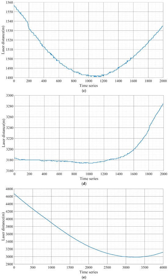 Experiments E and F used infrared vision sensors and visible vision sensors to geolocalize ground targets, respectively. In both sets of experiments, the UAV performs reconnaissance measurements of the target in a fly-over mode directly over the target at an altitude of 4300 m. The UAV flight trajectory and laser-measured distance in Experiment E are shown in Figure 3e and Figure 4e. The UAV flight trajectory and laser-measured distance in Experiment F are shown in Figure 3f and Figure 4f.