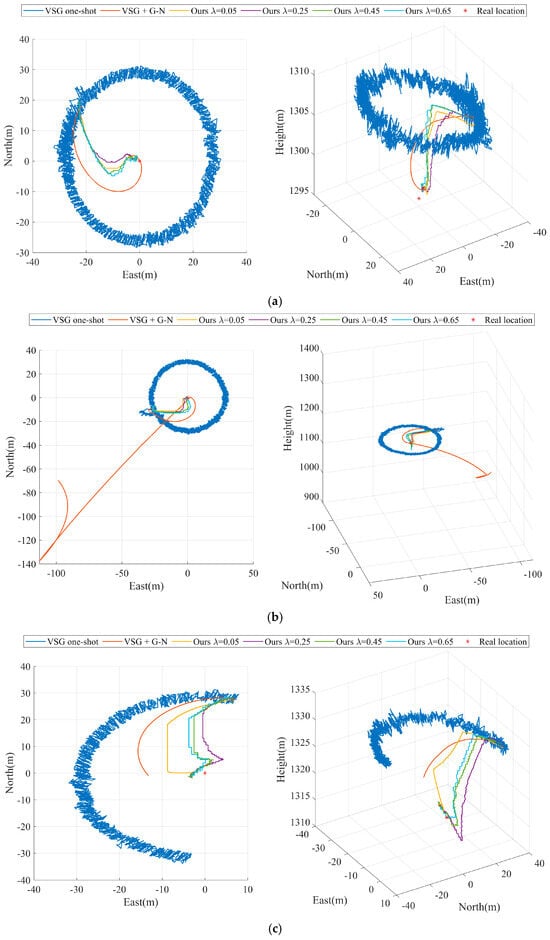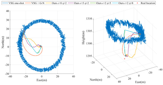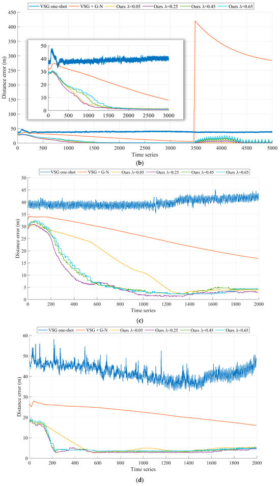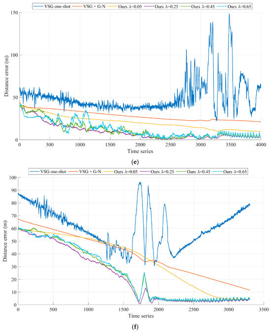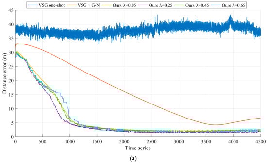 As shown in Figure 5a and Figure 6a, our algorithm performs optimally with the preset parameter of in Experiment A. After tracking measurements on ground targets for 40 s (the 1000th set of time series), the geolocalization accuracy of our method for remote targets on the ground converges to 5 m and stably maintains itself within this accuracy thereafter. As shown in Figure 6b, before and after briefly turning off and then on the laser ranging sensor in Experiment B, the experimental results exhibit two different convergence results. The experimental results before the 3000th set of time series are similar to those in Experiment A. During the second convergence process, the different preset parameters of our algorithm exhibit convergence again, where the optimal preset parameter is . This is due to the fact that the smaller convergence step size greatly limits the target geolocalization drift when experiencing measurement disturbances. The VSG + G-N method, which is affected by Gaussian Newton algorithms, is trapped in a local optimum and cannot be corrected back to a reasonable range in a short period of time. The VSG method does not use laser range sensors to participate in the geolocalization of the ground targets and therefore is not disturbed by laser range sensor errors.