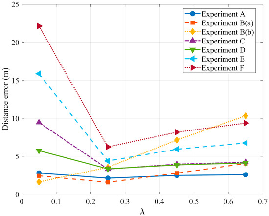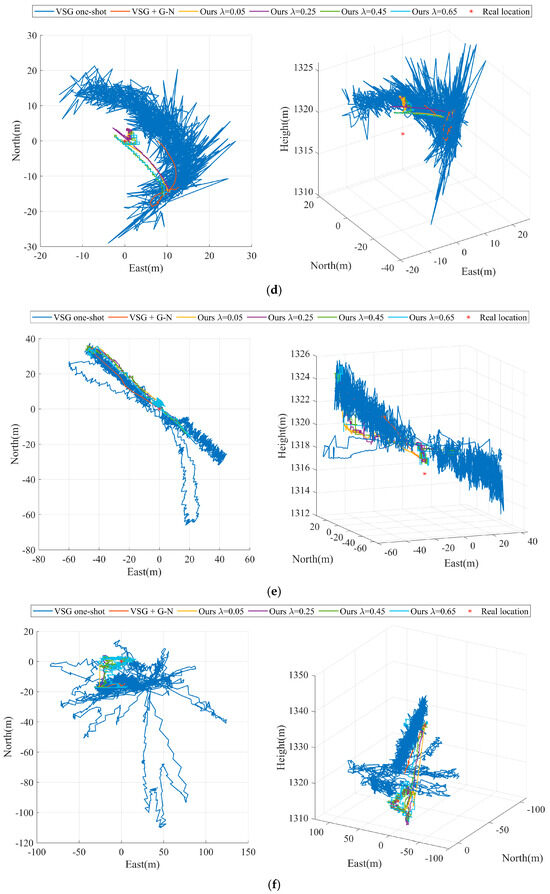 In both Experiment E and Experiment F, the UAV is in a reconnaissance mode flying directly above the target, simulating the potential military bombing scenario. Combining Figure 4f and Figure 6f, we can find that the geolocalization accuracy of the target fluctuates significantly when the UAV is directly above the target, i.e., near the 1800th set of time series. This is due to the Eulerian angle deadlock of the UAV payload in the positive downward view, when the reliability of the attitude angle information of the UAV payload is weaker than that of the laser measurement of the distance. In Experiment E, our algorithm performs best with the preset parameter of . As shown in Figure 4e and Figure 6e, the results of Experiment E present the same phenomenon.